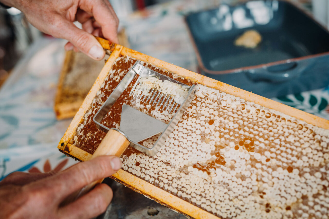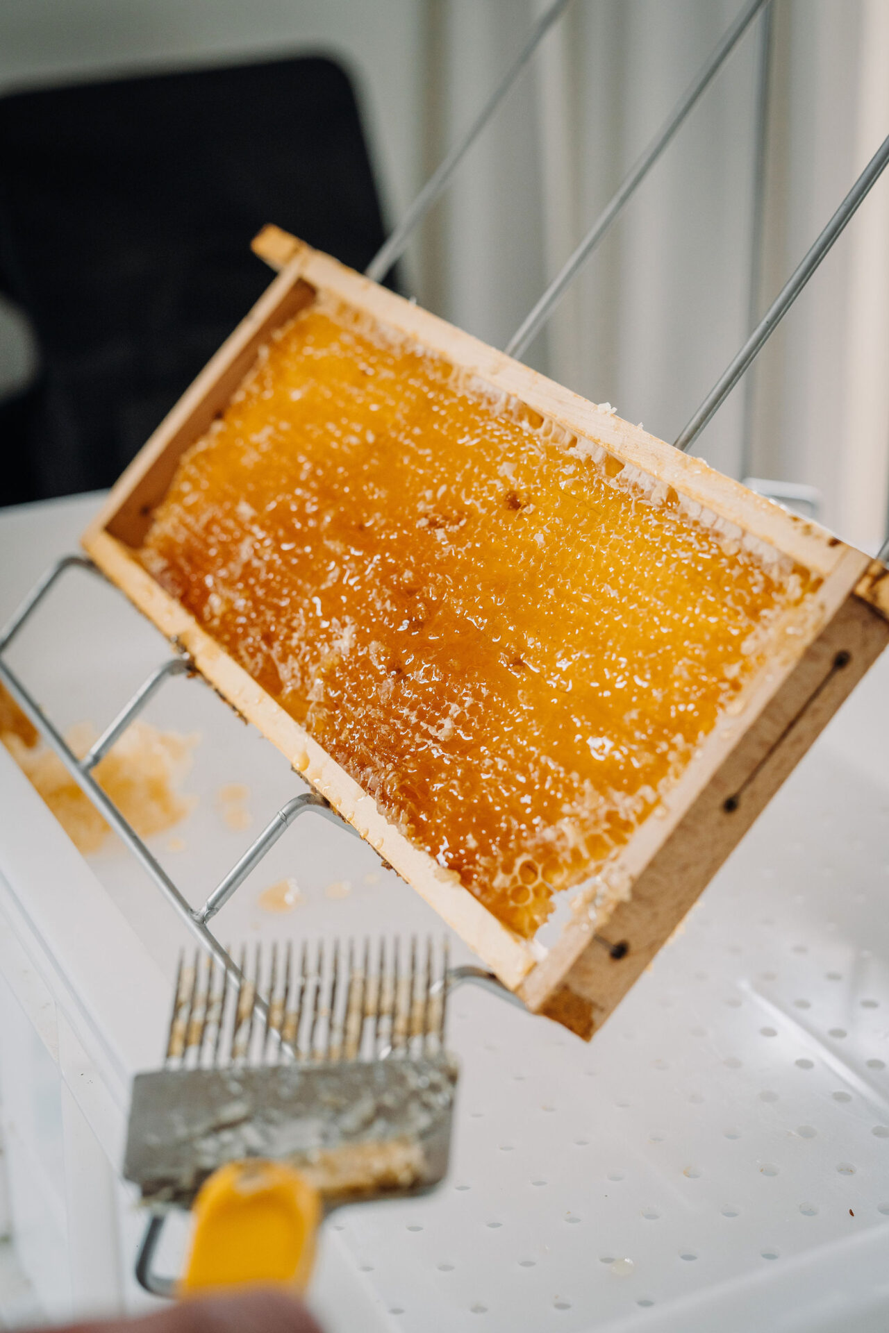Wanneer een heel honingraam is afgedekt met was, dan is deze rijp om geoogst te worden. Met een speciale vork halen we de waskapjes er voorzichtig af waarna we de honingramen in de zogenoemde slinger plaatsen. Dit is een soort centrifuge waarmee je de honingramen snel laat ronddraaien. De honing wordt er op die manier uit geslingerd.