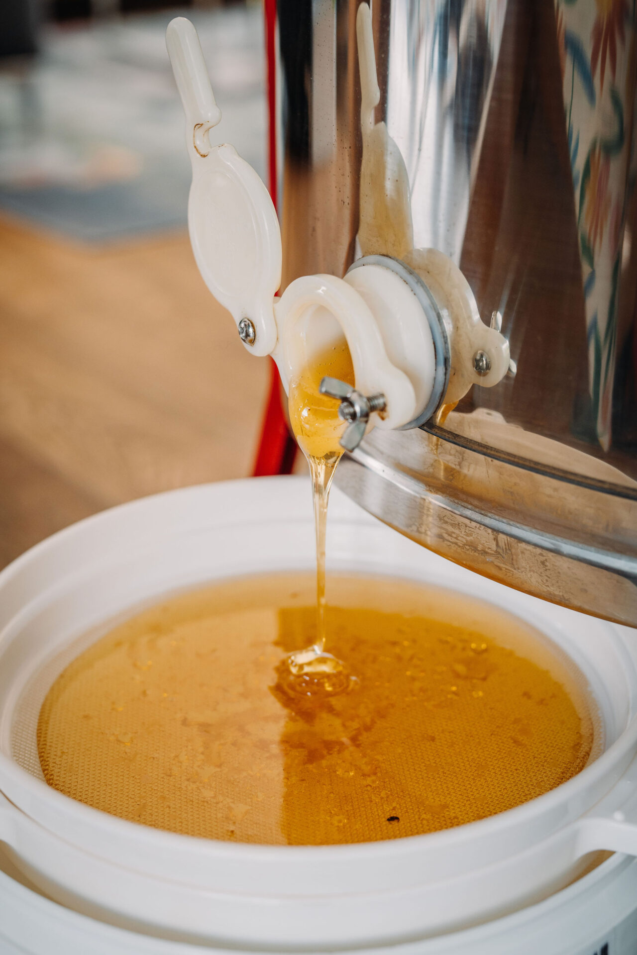 De honing van de bijen in het park ‘slingeren‘ we meestal 1 keer per jaar, namelijk in juli.